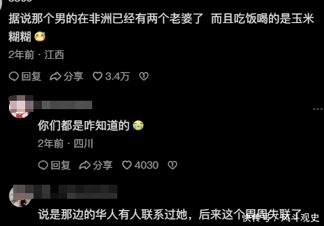 不知从何处传来的音尘,说阿谁黑东说念主大叔在非洲依然有两个爱妻了,况兼吃饭喝的王人是玉米糊糊,她随着去即是遭罪的,批驳区的网友也王人劝她飞速细密。