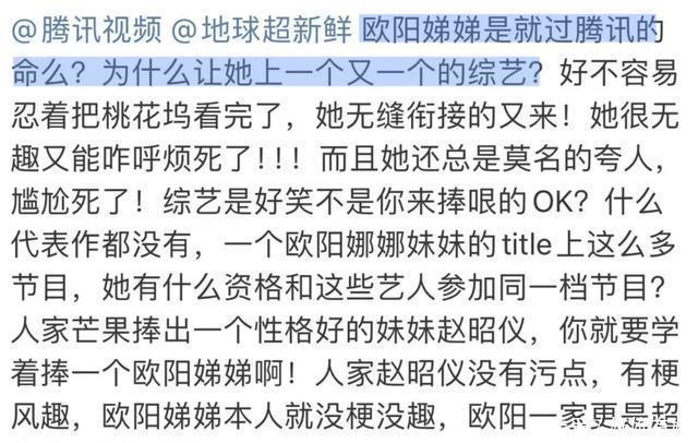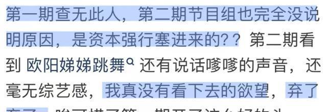 着名度不算高却能频频进入综艺,是资源咖,靠姐姐欧阳娜娜的东说念主脉进文娱圈等各样成分。